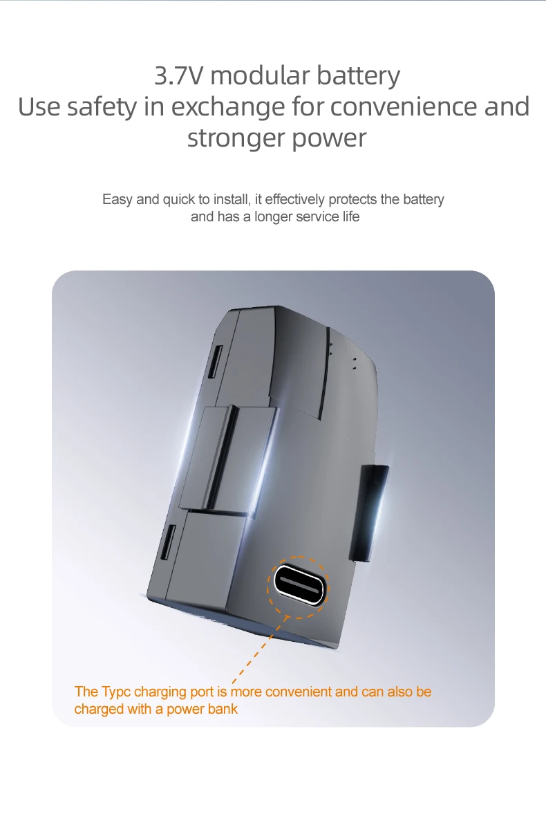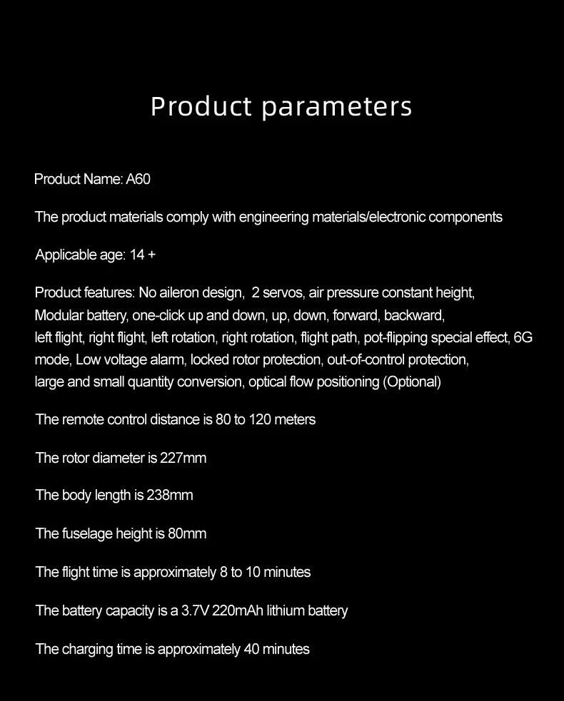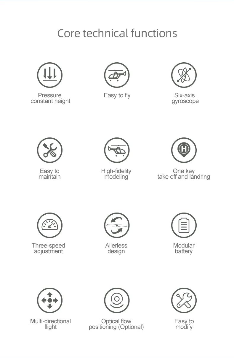 7.Alarma de bajo voltaje, protección contra bloqueo, seguridad contra fallos, ajuste de timón alto y bajo, despegue con un solo toque y aterrizaje con un solo toque.