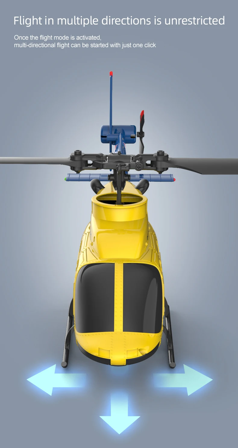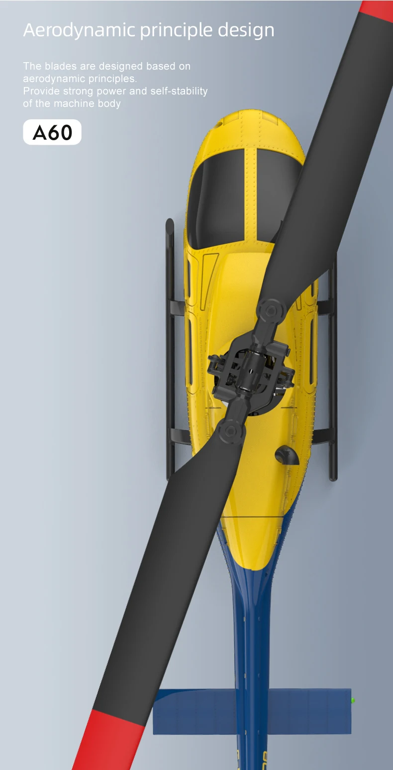 1.Diseño sin flybar.Las hélices diseñadas utilizando principios aerodinámicos proporcionan potencia y estabilidad potentes.Giroscopio de 6 ejes para vuelo ultraestable.